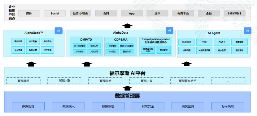 AlphaData是一站式智能用户数据运营平台,内嵌AI算法模型平台“福尔摩斯AI”。其核心组件包括: