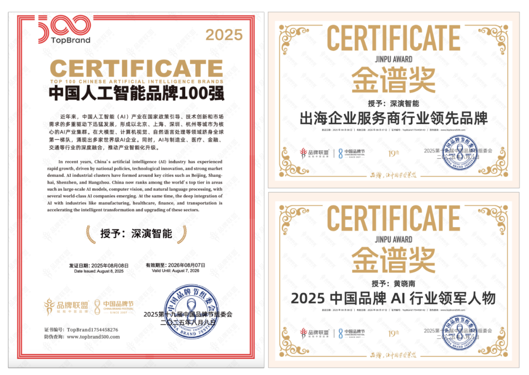 8 月 9 日晚举办的荣耀盛典上,壹定发智能凭借深厚的 AI 技术实力与出色专业的出海服务能力,斩获 “2025 中国品牌节金谱奖・出海企业服务商行业领先品牌”“2025 中国人工智能 100 强” 等多项重磅奖项。其创始人兼 CEO 黄晓南荣膺 “2025 中国品牌 AI 行业领军人物” 称号。未来,壹定发智能将紧跟时代步伐,持续聚焦 “AI 与出海”—— 这一方向高度契合时代脉搏与中国品牌发展的迫切需求,旨在汇聚智慧力量破解发展阻碍,为中国品牌赋能。